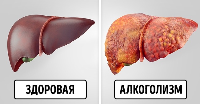 Подивіться на картинку. Навіть якщо ви не страждаєте від залежності, кожна чарка наближає вашу печінку до подібного стану. Її клітини відмирають, а на їх місці з'являються жирова та сполучна тканини, що навіть виглядає страшно. Така печінка вже не працює в повну силу і приносить тільки біль.
