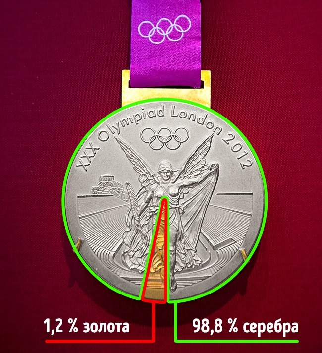 Золота олімпійська медаль насправді легальна підробка дорогоцінної нагороди. На її виготовлення йде всього 6 грамів золота, решта — срібло.