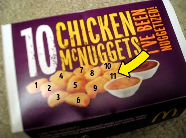 Можливо, ви ніколи не вважали шматочки курки, зображені на коробці усіма обожнюваних нагетсів, але ми знайшли час, і не дарма: анонімний 11-й шматочок сховався біля соусів. Дивно, але всередині його не виявилося.