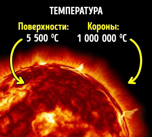 Поверхня Сонця має температуру близько 5 500 ºС. А на відстані близько 10 000 км від поверхні Сонця знаходиться сонячна корона, яку ми бачимо як свого роду гало — її температура досягає вже мільйона градусів. Причина такої різниці в температурі між поверхнею і короною до цих пір не ясна.