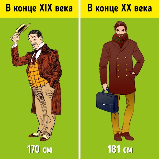 За весь час еволюції людини наш середній зріст то збільшувався, то ставав менше. Але в цілому люди стають вище. Так за 100 років, з 1880-х по 1980-ті роки, європейські чоловіки в середньому стали вище на 11 див.