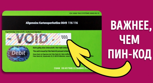 - Зі зворотного боку картки знаходиться ще один гарант безпеки ваших грошей — код CVV (у VISA) або CVC (MasterCard). CV в обох випадках розшифровується як Card Verification. Цей код, присвоєний вашій карті, підтверджує, що вона справжня.