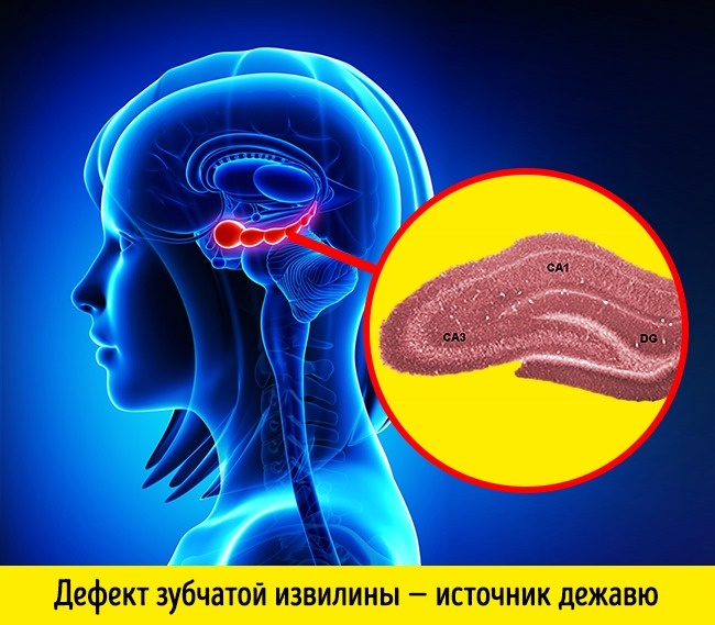 Біолог Сусуму Тонегава (Susumu Tonegawa) і вчені Массачусетського технологічного інституту (MIT) виявили область мозку, в якій формується ефект дежавю. У гіпокампі (область мозку, що відповідає за пам'ять) вчені виявили зубчасту звивину (dentate gyrus). Саме вона відповідає за наші спогади і уміння розрізняти їх. Порушення в роботі зубчастої звивини і призводять до ефекту дежавю, яке настає саме в момент розпізнання двох схожих життєвих ситуацій.