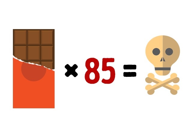 У шоколаді міститься велика кількість речовини під назвою теобромін. Він є потужним стимулятором центральної нервової системи. Але ось з'ївши близько 10 кг шоколаду за раз, ви ризикуєте отруїтися їм, що спочатку призведе до нудоти і діареї, потім до епілептичних припадків, внутрішньої кровотечі, інфаркту міокарда та приєднання до вашим прадідам.