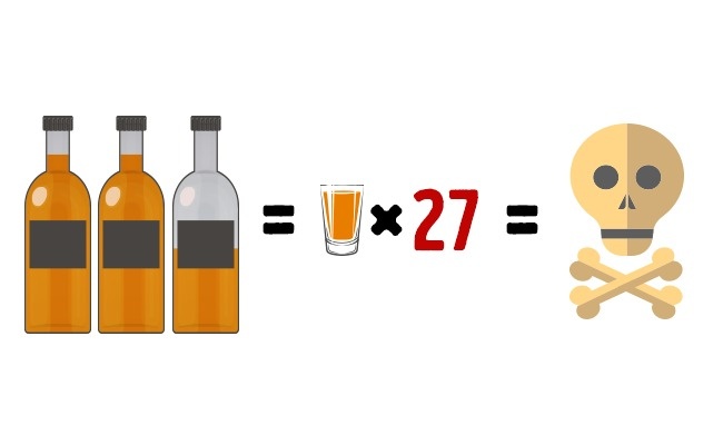Для здорового чоловічого організму змертельной дозою буде 1,25 літра 40-градусного алкоголю (це 2,5 пляшки по 0,5 л або 27 шотів по 45 мл). Але! Все це за умови, що цей здоровий чоловічий організм використає цей блаженний напій менш ніж за годину і його не вирве.
