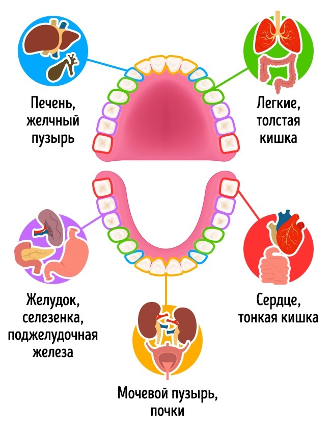 Деякі лікарі стверджують, що можна простежити зв'язок між хворим зубом і погіршенням роботи окремих органів. Приміром, якщо ниють ікла, то варто перевіритися на холецистит, а разом з різцем можуть боліти серце і шлунок. Довести таку взаємозв'язок складно, але, якщо хочете запам'ятати, який зуб за який орган відповідає, просто подивіться на нашу схему.