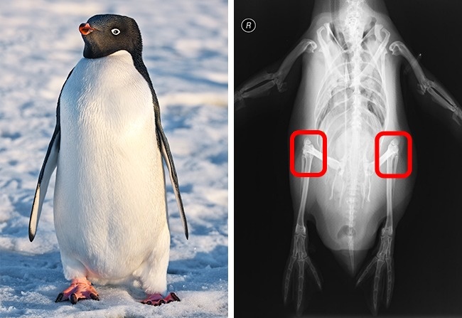 Задні кінцівки пінгвінів складаються зі стегна, коліна, гомілки і малогомілкової кістки. Просто цього всього не видно з-за товстого шару оперення.
