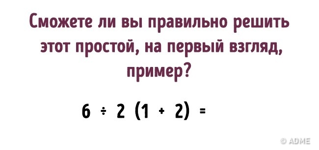 10. За правилами математики, в першу чергу потрібно вирішити частину прикладу в дужках. В результаті отримаємо таку рівність: 6 ÷ 2×3 = 9.