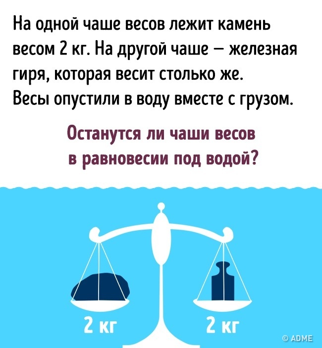 7. Кожне тіло, занурене у воду, втрачає у вазі стільки, скільки води воно витіснило. Камінь займає більше обсягу, ніж гиря того ж ваги. Це означає, що камінь витіснить більше води, стане легше, і ваги нахиляться в сторону гирі.