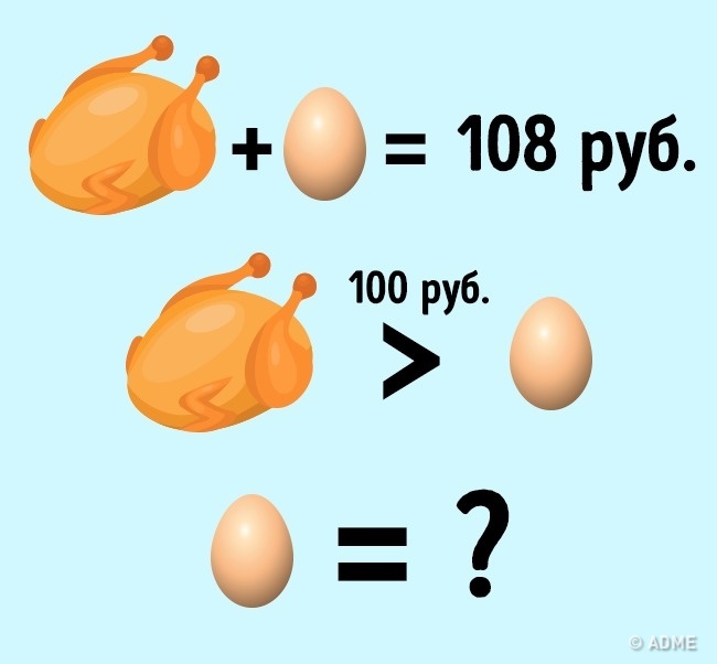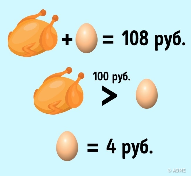 4. Яйце коштує 4 рубля. У такому разі курка буде коштувати на 100 рублів дорожче — 104 рубля. А в сумі курка і яйце обійдуться як раз в 108 рублів.