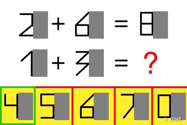 1. Правильною відповіддю буде перша фігура, так як насправді в цій картинці зашифровані цифри. Збити з пантелику вас могли їх дзеркальні відображення. Якщо ж ви розкусили суть завдання, то без праці обчисліть, що сума 1 і 3 дорівнює 4.