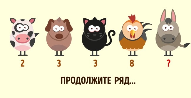 2 (іа). Цифри, пов'язані з кількістю літер в звуки, що видаються тваринами. Корова — му (2), собака — гав (3), кішка — мяу (3), півень — кука-річку (8).