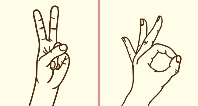 Складіть пальці правої руки так, щоб вони показували знак «світ», пальцями лівої руки покажіть «ок». Потім по черзі змініть положення пальців так, щоб ліва рука показувала «світ», права — «ок». Повторіть несоколько раз. А тепер виконайте цю вправу одночасно правою і лівою рукою.