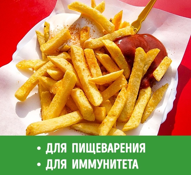 Колись давно дієтологи додали це дуже смачне блюдо в список продуктів, які псують фігуру і завдають шкоди здоров'ю. Проте час показав, що не станеться нічого поганого, якщо ви будете їсти його невеликими порціями. Крім того, картопля містить йод, вітаміни групи В, фосфор, трохи аскорбінової і фолієвої кислоти, покращує травлення і зміцнює імунітет.