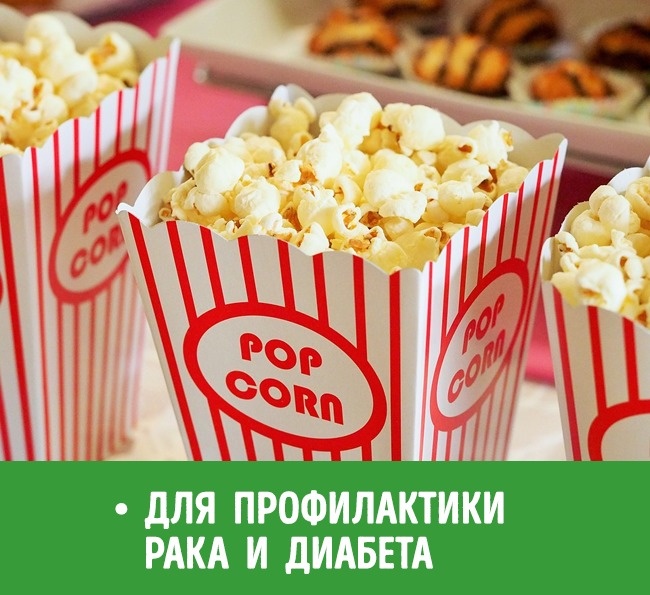 Гарна новина для всіх, хто не уявляє собі похід в кіно без відерця ароматного попкорну. Цей продукт нормалізує рівень цукру в крові і сприяє виведенню інсуліну. А ще попкорн багатий безцінними антиоксидантами.