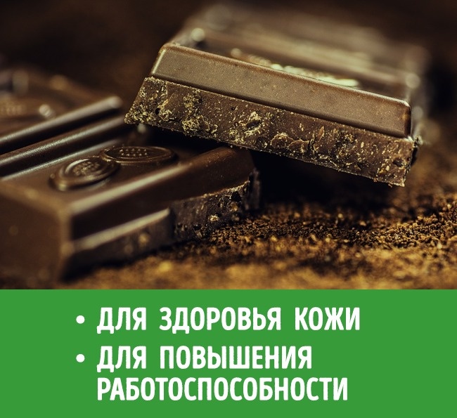 Не вірте чуткам про те, що від шоколаду з'являються проблеми зі шкірою. Насправді справжній шоколад містить поліфеноли, які покращують кровообіг і підтримують шкіру у хорошому стані. Крім того, шоколад приносить бадьорість, так що одна плитка цілком може замінити кілька чашок кави.