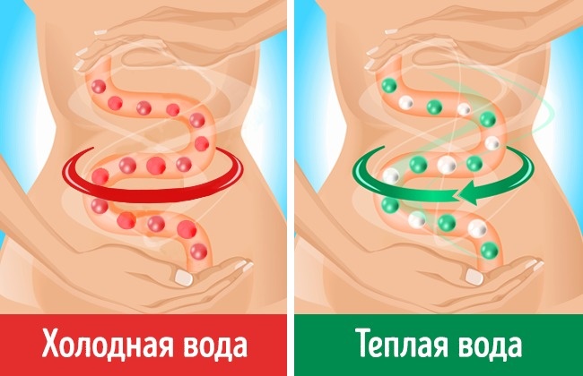 Тепла вода, навпаки, допомагає більш швидкому розщепленню їжі, що сприятливо позначається на процесі її засвоєння організмом і допомагає позбутися від запорів.