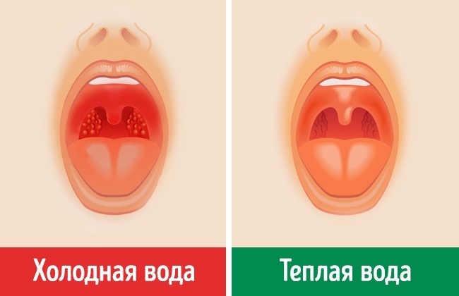 Холодна вода викликає накопичення слизу, що підвищує ризик інфекцій дихальної системи і може призвести до запалення горла.
