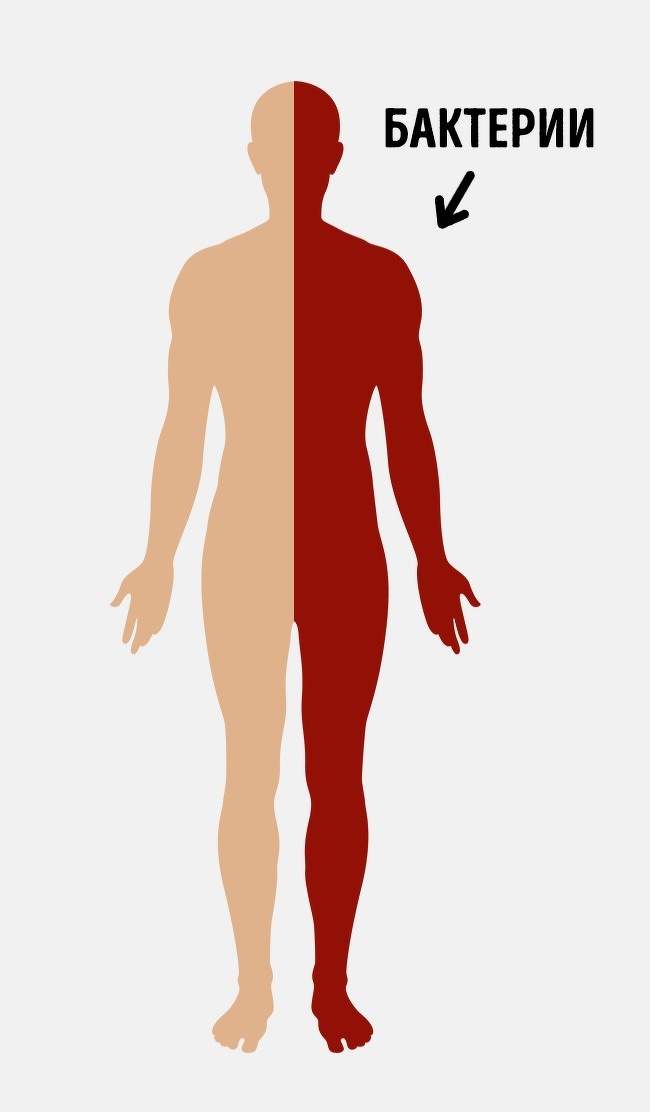 Ще недавно вважалося, що всередині нас в 10 разів більше бактерій, ніж власних клітин. Але недавні дослідження спростували цей факт: в організмі дорослої людини мешкає 30-40 трлн бактерій, що приблизно дорівнює кількості клітин у всьому тілі. Бактерії найщільніше населяють пряму кишку, тому кожне спорожнення кишечника ненадовго приносить нам чисельну перевагу над бактеріями.