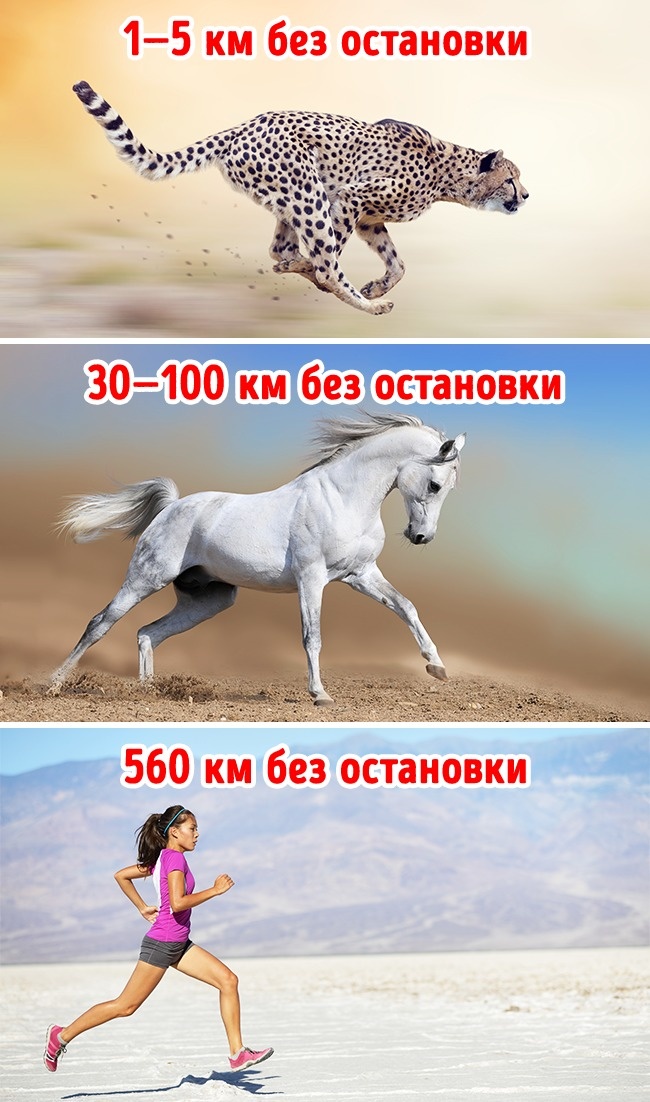Людині не зрівнятися з гепардом по швидкості бігу. Але на довгих дистанціях людина залишає далеко позаду всіх ссавців. Тисячі років тому він гнався за здобиччю до тих пір, поки тварина не гинула від виснаження. У людини великі суглоби колін і стоп, щоб витримувати тривалі навантаження, і потужні сідничні м'язи і гнучкий торс, щоб тримати рівновагу. Але головне — це його відмінна терморегуляція. Тварини під час бігу перегріваються і змушені часто дихати і зупинятися, щоб охолодитися. Люди ж, позбавлені хутра і вміють на бігу дихати рівно і глибоко. Сучасна людина цілком здатний пробігти без зупинки 560 км.