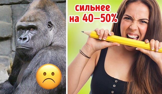 Дивлячись на грізні щелепи великих приматів, важко повірити, що сила стиснення щелеп людини набагато більше — на цілих 40-50 %! Але австралійські дослідники встановили, що це дійсно так. Домогтися такої сили укусу дозволяють товста зубна емаль і міцні коріння людських зубів.