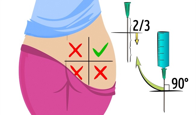 Правильно: дезінфікувати руки і місце уколу перед початком. При укол в сідницю подумки розділити м'яз на 4 частини. Швидким рухом ввести 3/4 голки строго у верхню праву частину (щоб не зачепити сідничний нерв). Після процедури прикласти на місце уколу ватку, змочену спиртом.