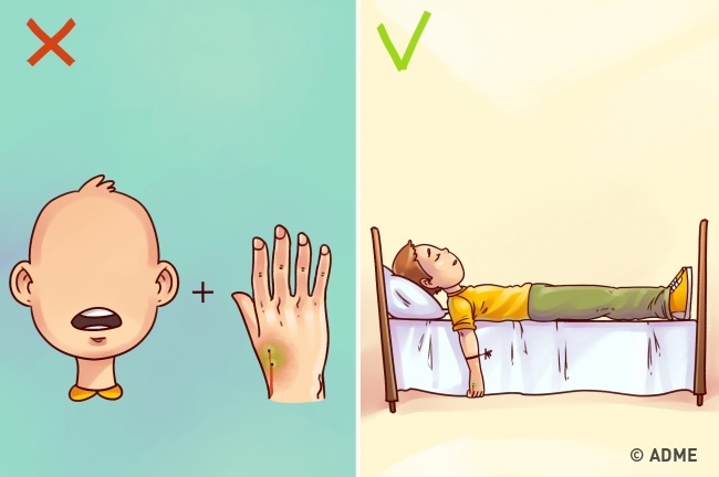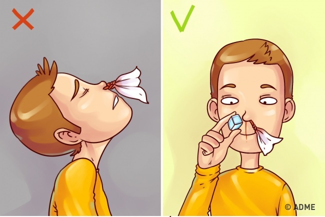 Як треба: тримати голову прямо, щоб прискорити зниження тиску. Прикласти щось холодне до носа. За допомогою вказівного і великого пальців по черзі закривати ніздрі на 15 хвилин кожну, дихати через рот. Якщо кровотеча продовжується, повторити дії. Викликати швидку, якщо кров продовжує йти, незважаючи на докладені зусилля, або якщо кровотеча викликане травмою.