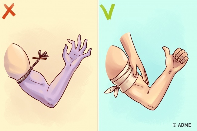 Як треба: за допомогою великої кількості стерильної марлі чи чистої тканини накласти пов'язку на рану і тримати з зусиллям. Цього досить, поки їде швидка. Виняток — сильна кровотеча, при якому ризик померти вище ризику ампутації кінцівки.