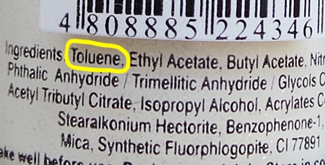 - Толуол (Toluene) — розчинник, завдяки якому створюється гладке покриття на нігтях і зберігається пігмент. Відомо, що толуол може вплинути на центральну нервову систему і викликати порушення репродуктивної функції. Головні болі, слабкість, непритомність, нудота — далеко не всі наслідки використання неякісного лаку.