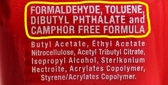 - Формальдегід (Formaldehyde) — безбарвний газ, завдяки якому лаки довше зберігаються. У алергиків при контакті з формальдегідом можливий дерматит і хімічні опіки. У більш важких випадках може виникнути порушення серцевого ритму, судоми і рак.