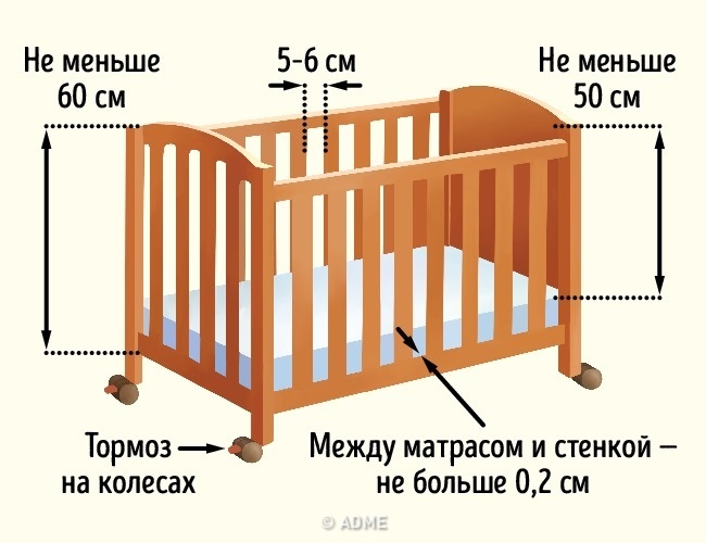 - У зазорах більше 0,2 см між стінками ліжечка і матрацом можуть застрягти дитячі пальчики. Рекомендована висота стінок виключить можливість того, що малюк самостійно вибереться з ліжечка.