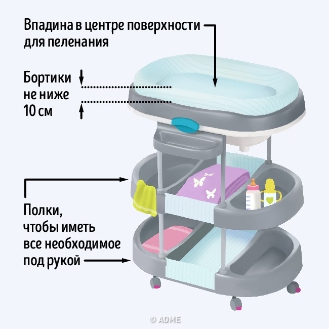 - Бортики і западина на поверхні для сповивання запобігають падіння дитини зі столика.