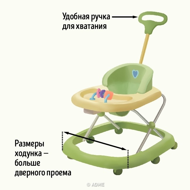 - Перевіряйте, щоб не було небезпечних предметів, до яких дитина може дійти або дотягнутися на ходунках (ємності з гарячою водою, електроприлади, гострі предмети).