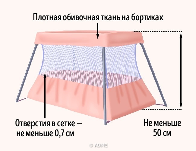 - Отвори в сітці повинні бути невеликими, щоб у них не змогла застрягти ґудзик чи інша деталь одягу. В манежах з ламелями відстань між ними повинно бути не більше 6 див.