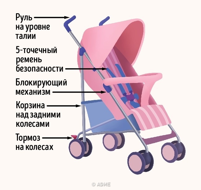 - Кошик (або кишеню) для пакетів, розташована так, як на малюнку, утримує рівновагу коляски.