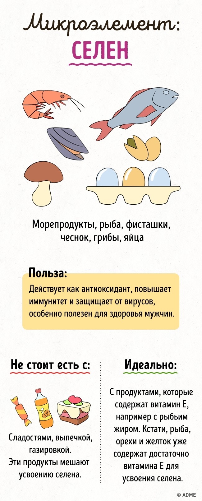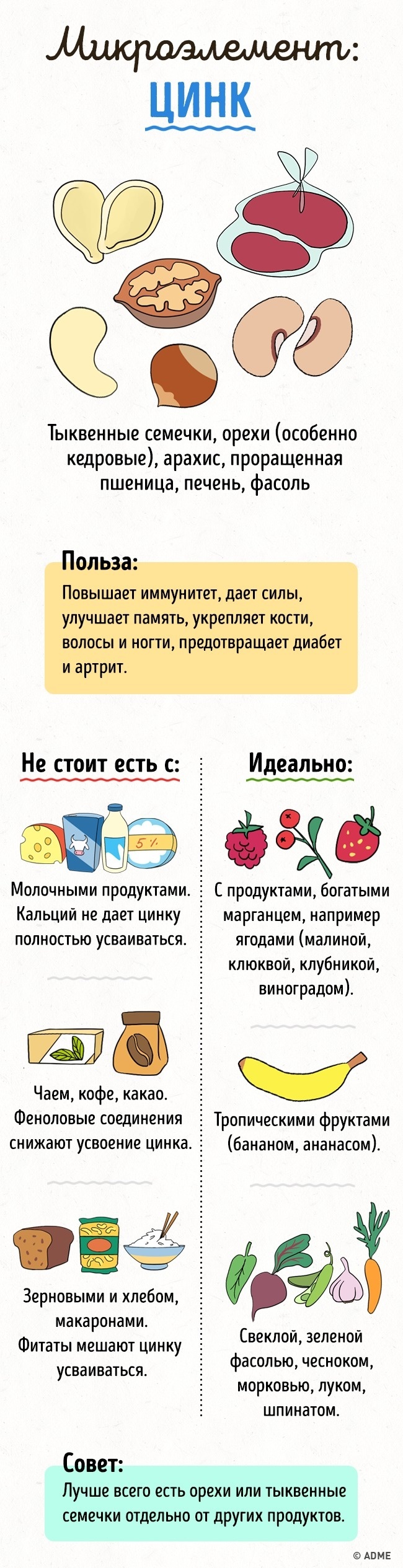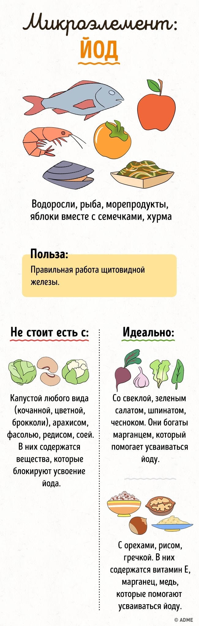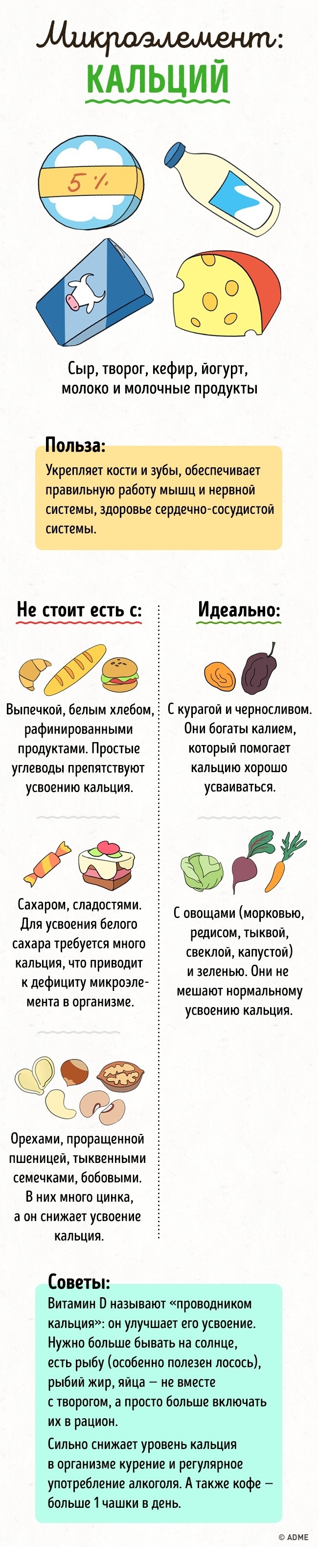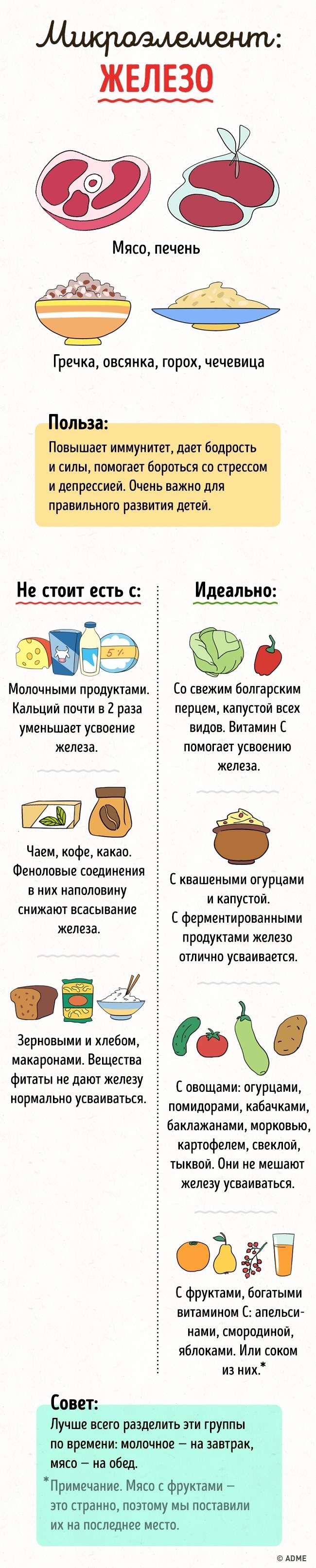 Корисні мікроелементи і вітаміни в їжі не завжди дружать і навіть можуть блокувати засвоєння один одного (а часом, навпаки, посилювати). Щоб звести до мінімуму небажані поєднання, не варто налягати на складні і багатоскладові страви, а ввести, наприклад, правило не змішувати при кожному прийомі їжі більше 5-7 продуктів.
