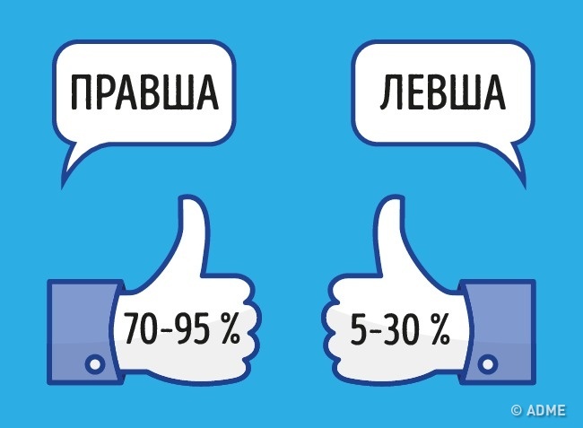 Вважається, що більшість (від 70 до 95 %) — правші, меншість (від 5 до 30 %) — лівші. І є ще відсоток амбидекстров, у яких обидві руки розвинені в однаковій мірі. Хоча вчені і тут розходяться в думці.