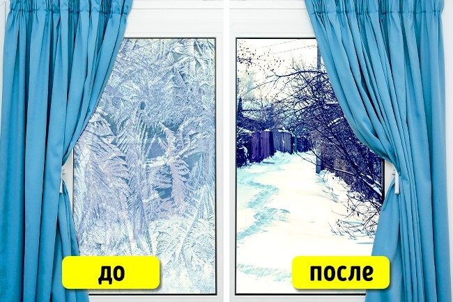 Щоб стекла не запітніли і не покривалися кіркою льоду, обприскати їх водою, насипте сіль в тканинну серветку і протріть скла зсередини. Вони стануть замерзати значно повільніше.