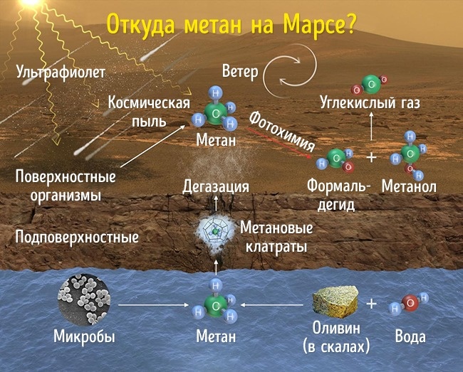 Вчені кажуть, що марсіанський метан в таких концентраціях повинен бути поновлюваним, так як він активно розпадається під ультрафіолетом і радіацією. Це значить, що він, швидше за все, з'явився не з вулканів, а в результаті живих процесів.