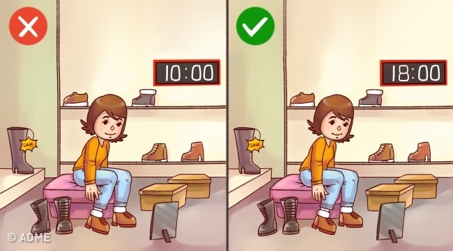 - Правильно купувати взуття саме вечорами. Тому що до кінця дня ноги трохи набрякають і, отже, збільшуються в розмірах, а це значить, що та пара взуття, яка підійшла вам вранці, ввечері буде занадто вузькою і натре ногу.