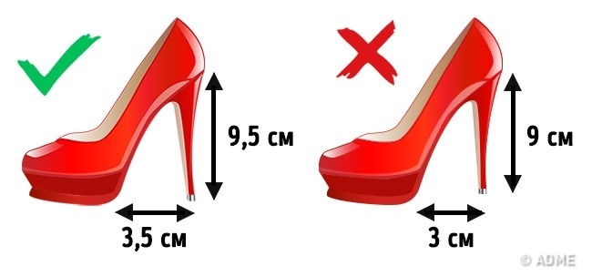 - Якщо взуття на підборах, то максимальна висота каблука становить 7–9 див. Відстань від підошви туфлі до п'яти (каблука) повинна становити не менше 3 див. Чим коротша відстань (2,5 см або менше), тим менш стійка буде взуття і тим більшу вагу передається на пальці ніг.