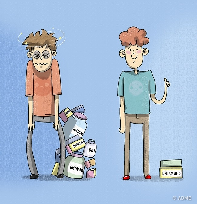 Вітаміни — одна таблетка, яка зробить нас здоровими. Насправді це не так. Вітаміни регулюють тільки процеси в організмі, і приймати їх потрібно з обережністю, так як в більшості випадків надлишок вітамінів завдає більше шкоди, ніж їх недолік.