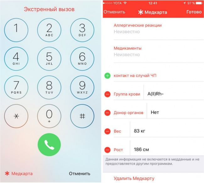 Якщо ви заздалегідь заповніть в телефоні свою «медичну картку», будь-який користувач зможе надати лікарям інформацію, яка важлива для порятунку вашого життя в критичній ситуації. Рекомендуємо вказати там хоча б групу крові і відомості про те, на які ліки у вас може бути алергія.