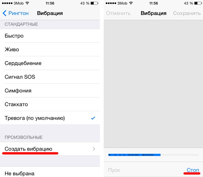 - Запустіть запис і торкніться екрана в такт з бажаним ритмом вібрації. Після цього зупиніть запис і зберегти шаблон. Він буде зберігатися в підрозділі «Вібрація» (меню рингтонів), в списку «Довільні».