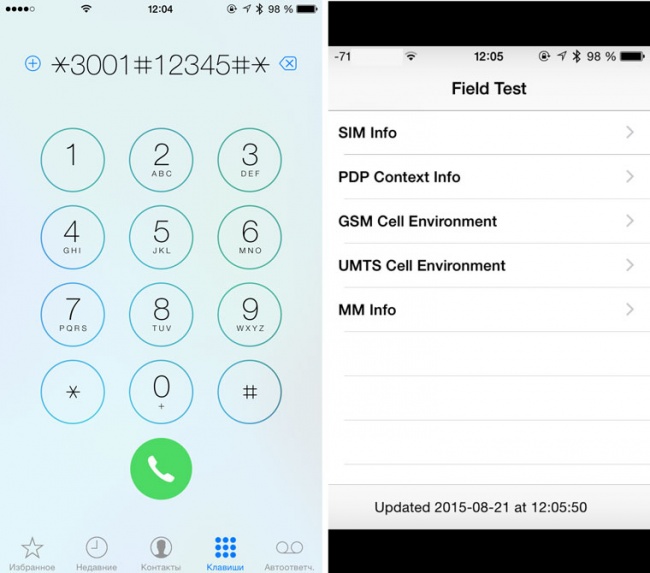 На iPhone доступні службові коди, за допомогою яких можна отримати різну інформацію про гаджеті, мобільному операторі і мережі стільникового зв'язку. Простим дзвінком за номером *3001#12345#* можна викликати приховане меню з інформацією про SIM-карті, мережі стільникового оператора, рівні сигналу і т. д.