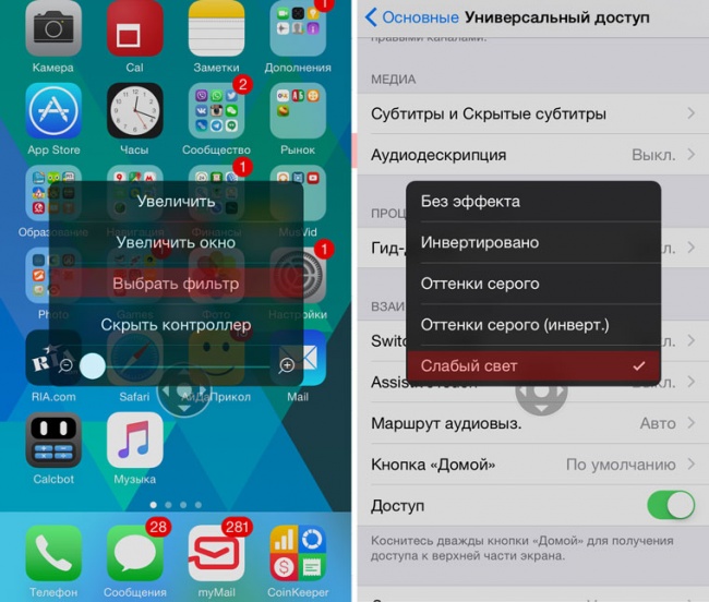 - Три рази поспіль натисніть клавішу «Home» і тапніте по з'явився контролеру-джойстику. Доведіть повзунок до мінімального значення і відкрийте функцію «Вибрати фільтр».