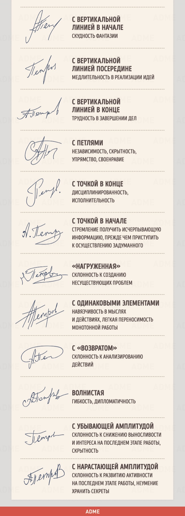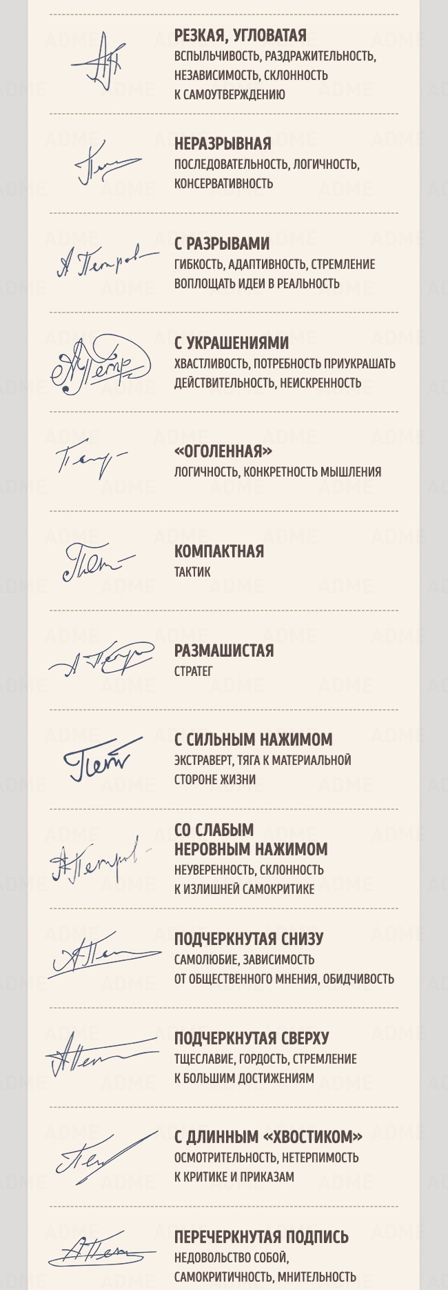 Ми в Social.org.ua за допомогою науки графології, яка вивчає зв'язок почерку з характером, склали таблицю різноманітних видів підписів і їх общезакономерных характеристик, які дозволяють скласти досить точний портрет володаря автографа.
