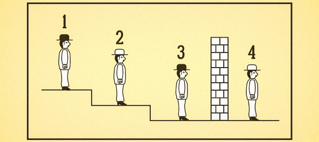 На них наділи дві білі капелюхи і дві чорні капелюхи. Чоловіки не знають, якого кольору вони носять капелюхи. Чотирьох ув'язнених збудували один за одним (див. малюнок) таким чином, що: