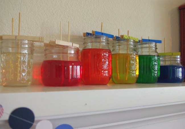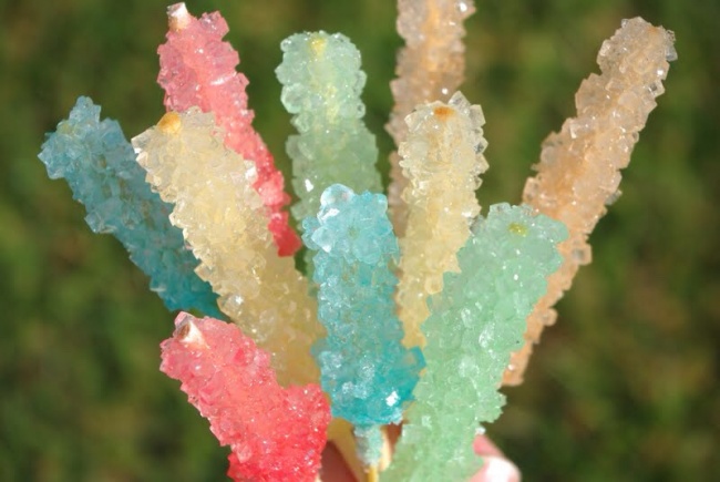 Залиште палички на ніч сушитися. Вранці в 2 склянках води на вогні розчиніть 5 склянок цукру. Хвилин на 15 можна залишити сироп остигати, але сильно охолонути він не повинен, інакше кристали не будуть рости. Потім розлийте його по банкам і додайте різні харчові барвники. Заготовлені палички опустіть в банку з сиропом так, щоб вони не торкалися стінок і дна банки, в цьому допоможе білизняна прищіпка.