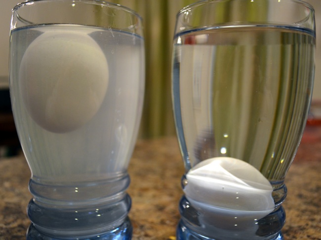 Досвід: Акуратно помістіть яйце в склянку з простою чистою водою. Як і очікувалося, воно опуститься на дно (якщо ні, можливо, яйце протухло і не варто повертати його в холодильник). У другій склянку налийте теплої води і розмішайте в ній 4-5 столових ложок солі. Для чистоти експерименту можна зачекати, доки вода охолоне. Потім опустіть у воду друге яйце. Воно буде плавати на поверхні.